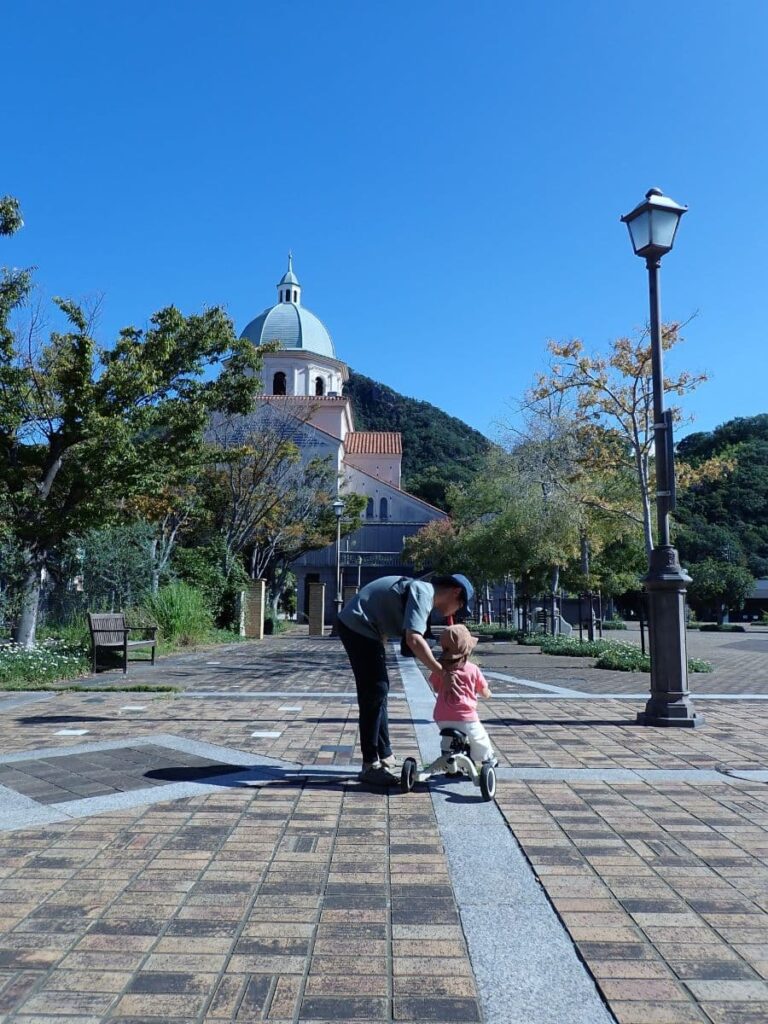 夫と娘は、三輪車を漕ぐ練習へ。