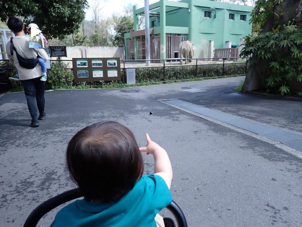 そして、ベビーカーに乗る1歳の 力強い指さし!