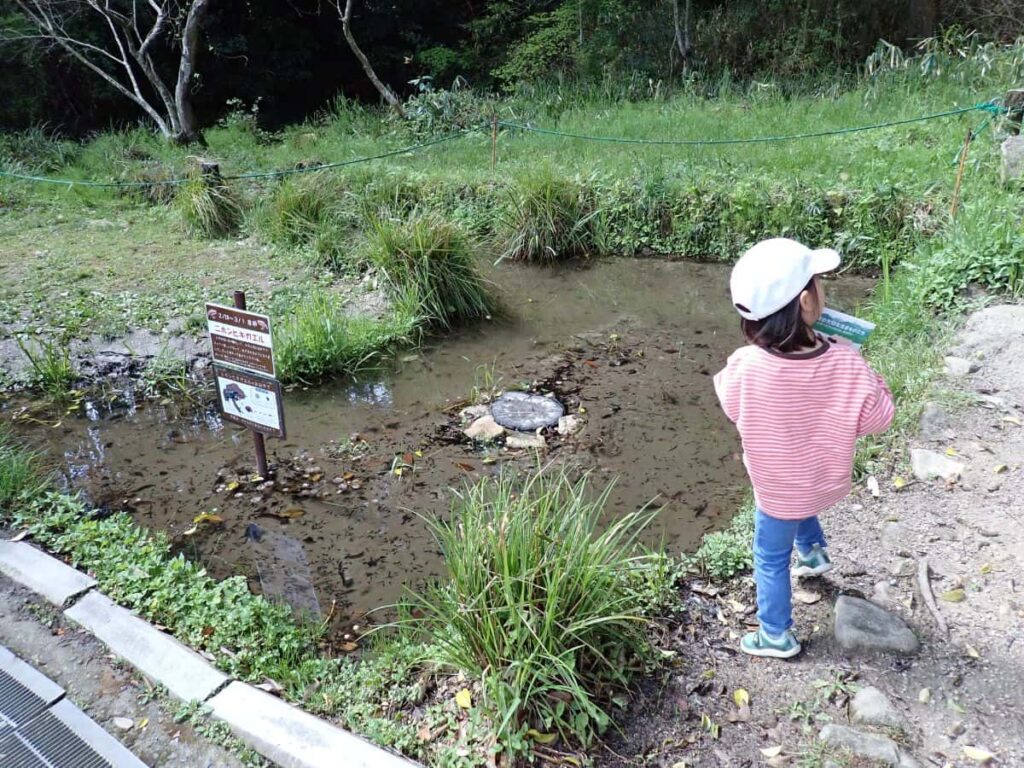 この日は ビオトープの観察も行われていました。大量発生していたオタマジャクシに興味を示す3歳。