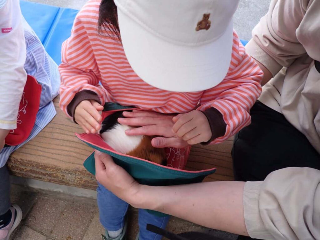 この日はポニーの乗馬体験(5歳から)と、テンジクネズミとの触れ合い体験をやっていました。ポニーは年齢制限に引っかかるので、テンジクネズミの方を体験に。