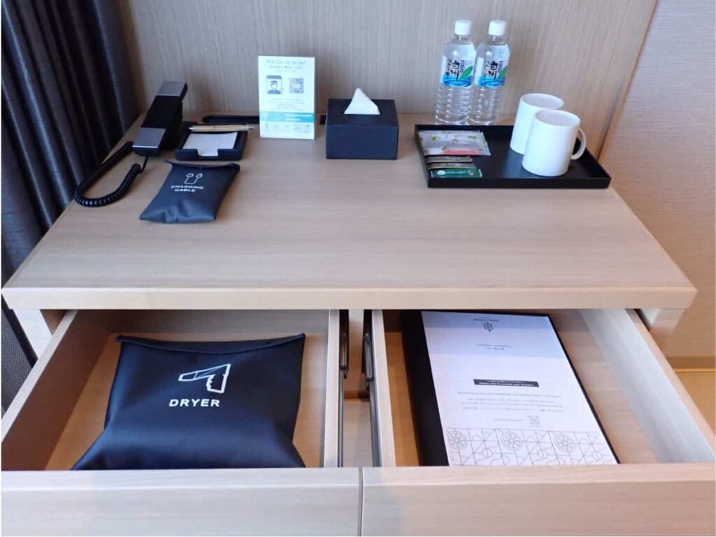 お部屋の角には、お水やカフェ、充電ケーブルなど。(お湯を沸かすポッドは下の段にありました。)