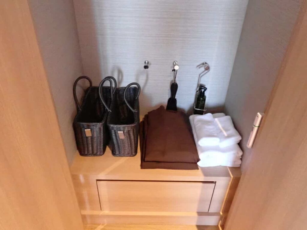 お部屋のクローゼットには、大浴場に持っていける温泉バッグや 館内着など。ホテル内は、館内着とスリッパでOK♩(夫)「やっぱり館内着があるといいよねー」