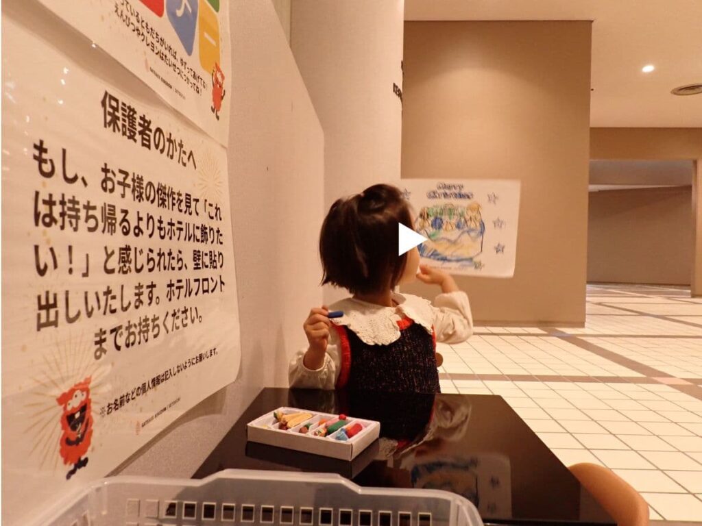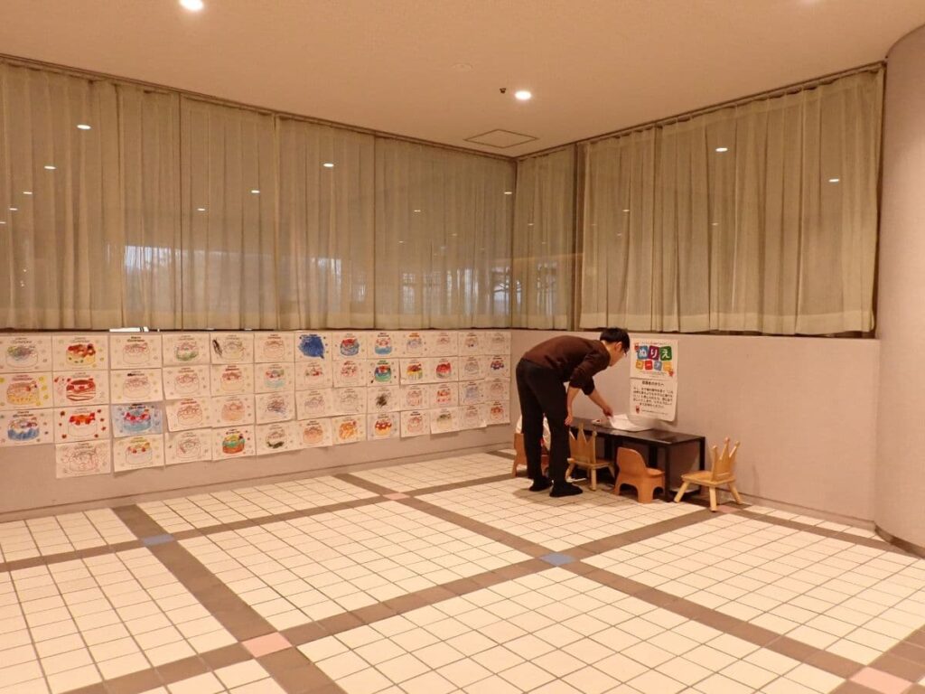 そして、3歳はロビーの一角にある「ぬりえコーナー」へ。クリスマスケーキの塗り絵が楽しめるようになっていました。