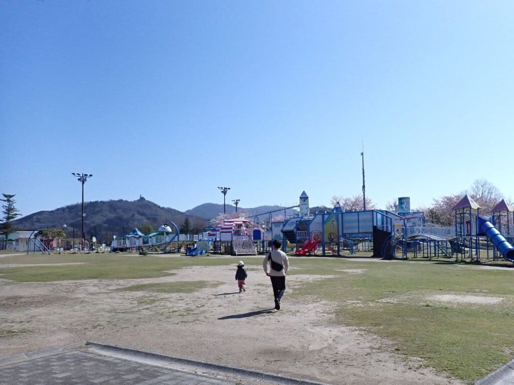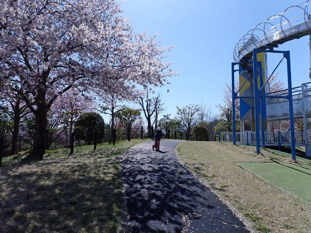 まだ人もまばらの、大型遊具群へ向けて駆け出す 3歳。「早く遊びたい!」
