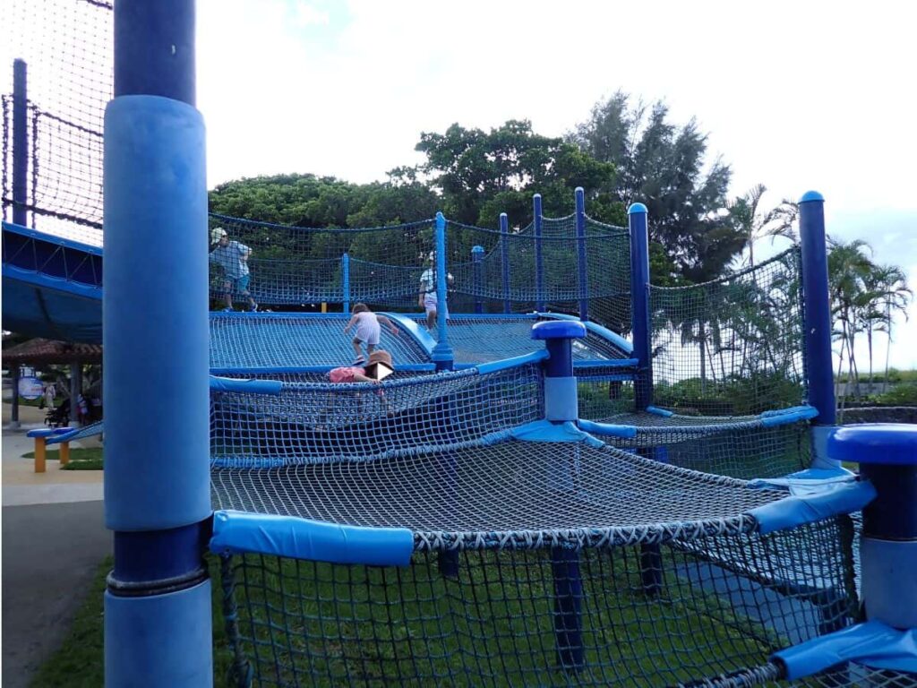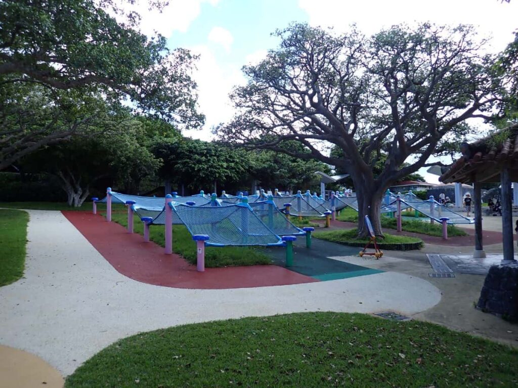 沖縄の海をイメージして作られている大型のネット遊具「ちびっことりで」。