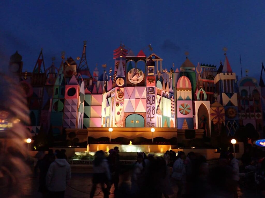 日が沈んで、ライトアップされたイッツ・ア・スモールワールド。