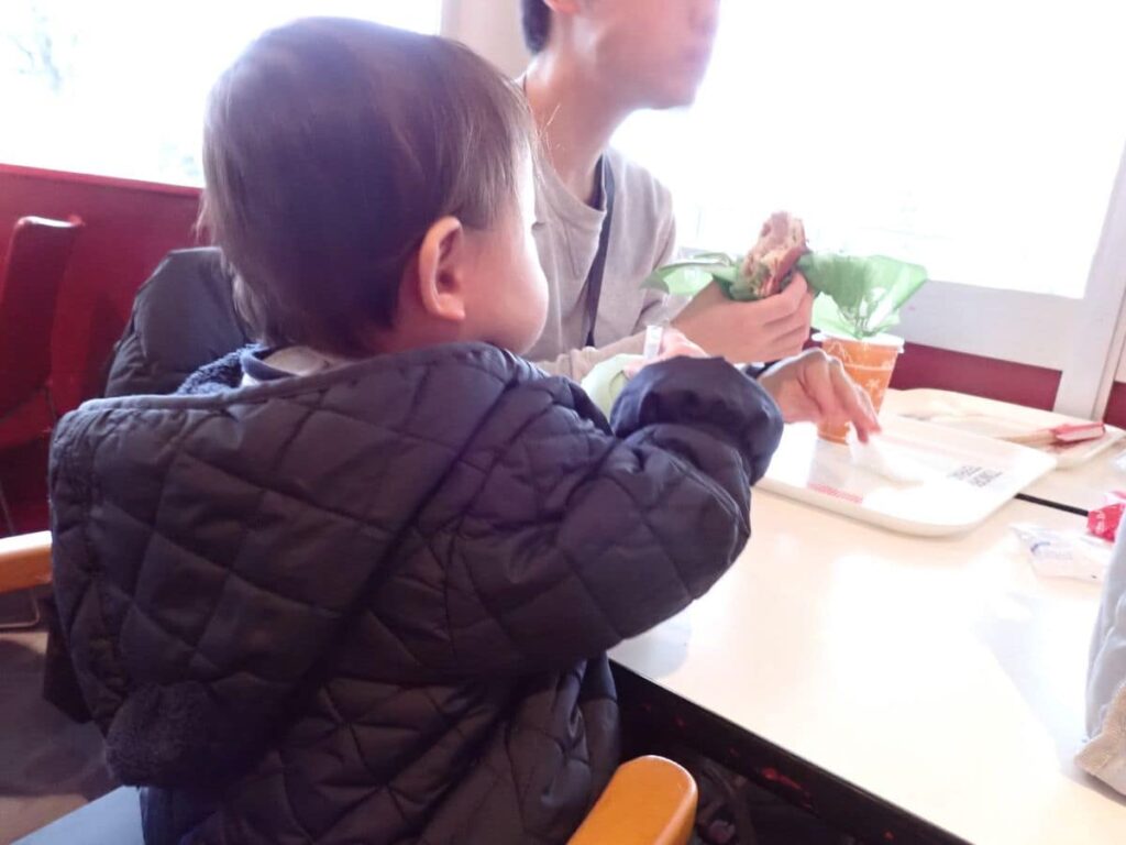 0歳におやつをしつつ、3人でテイクアウトグルメを食べて、パレードを待ちます。